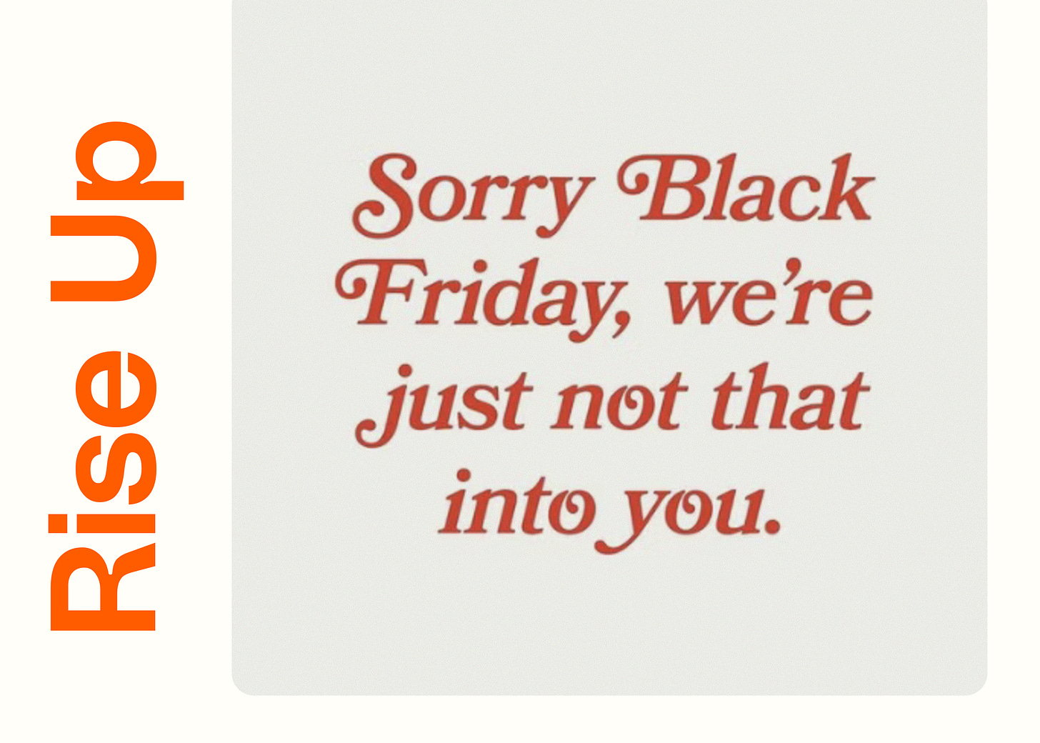 This is where brands throw up the peace signs instead of the promo banners. Black Friday is wrong. Think before you buy. The climate crisis wonât wait. Weâre all complicit in a system of overconsumption. Stores close for the day. You get told to go outside and hug trees. Some even raise prices and donate the difference to sustainable causes.